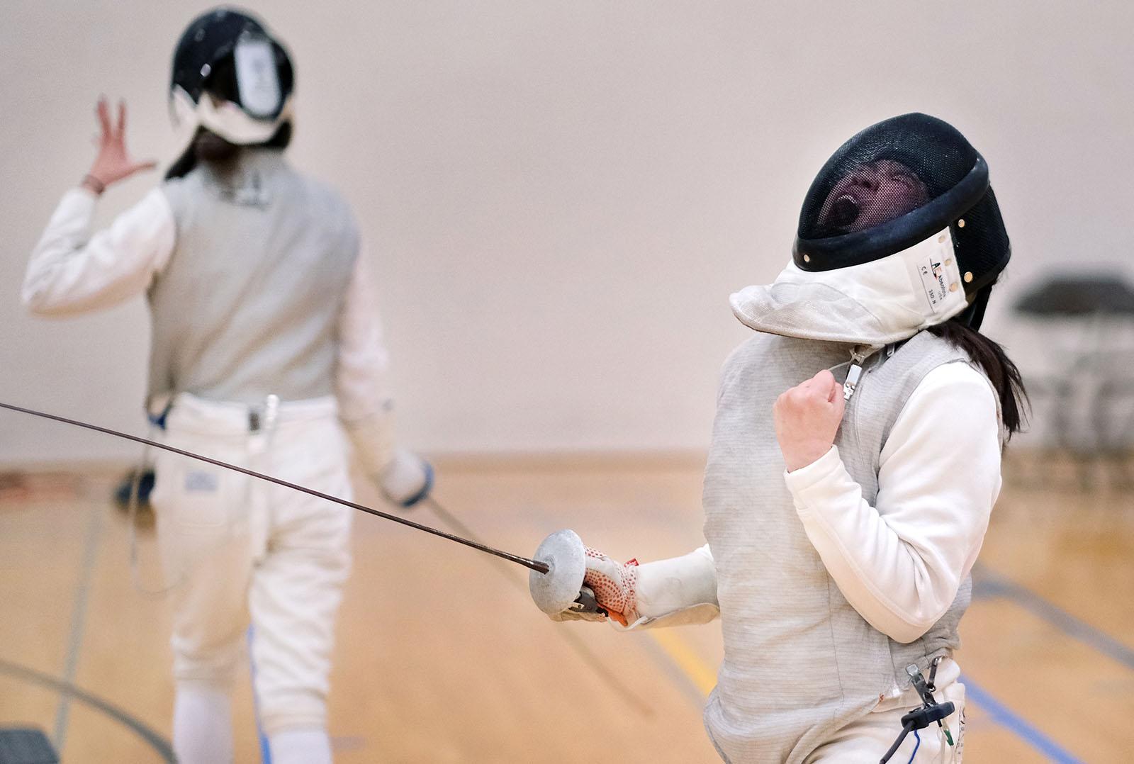 Lawrence fencer Sophia Kelley celebrates after scoring a touch during the Lawrence Duals in early November in the Wellness Center.