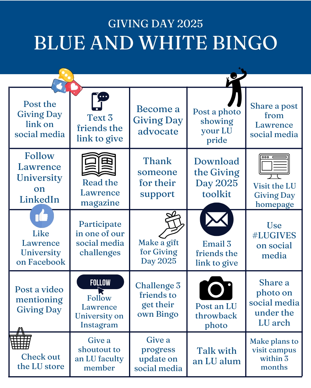 Celebrate on Social – The fun doesn’t stop off campus - We are celebrating over a decade of giving on social! With fun challenges to unlock game changer funds and an opportunity to win giveaways, this is something you won’t want to miss. Make sure to follow Lawrence University on Instagram, Facebook, and LinkedIn!
