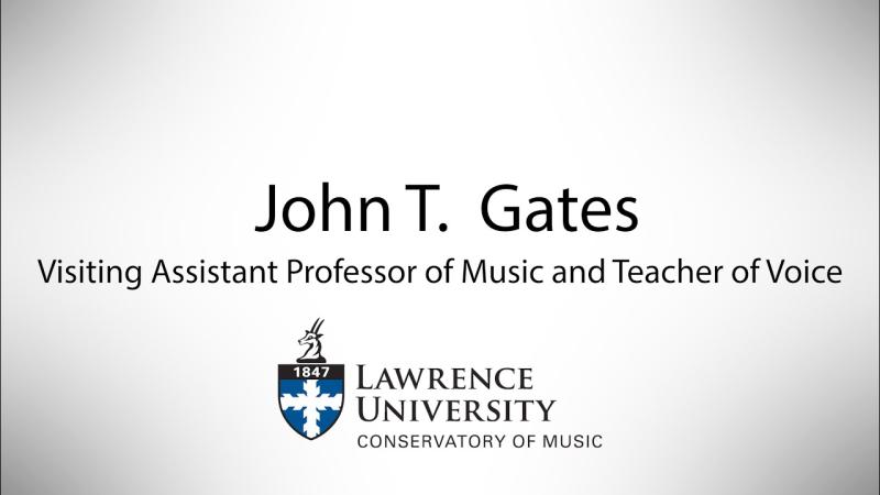 John T Gates, a member of the Lawrence voice faculty since 2005, was a bass soloist in German opera houses and concert halls (Mönchengladbach, Saarbrücken, Kiel, Wuppertal, and others) where he sang some 1000 performances over a period of thirteen years. His wide-ranging opera repertoire covers eighty roles and includes standard works (Sarastro in Mozart's Die Zauberflöte), early music (Ariodates in Händel´s Serse), and numerous world premiers (Oscar laureate Cong Su's Wenn die Sonne aufgeht). His concert and song repertoire includes Verdi's Requiem, J. S. Bach's St. John's Passion, and Schubert's Winterreise.